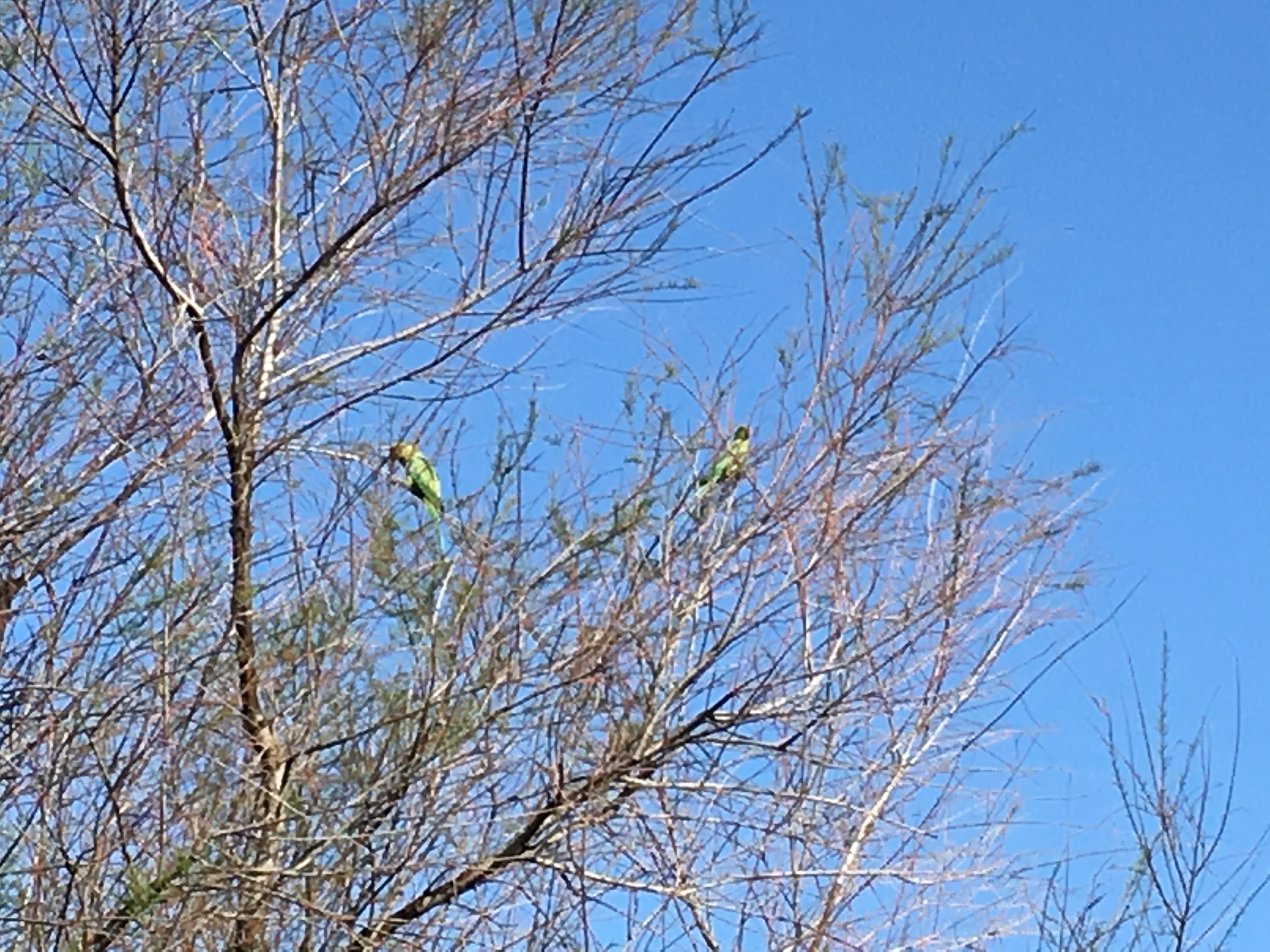 Grüne Papageien in den Bäumen.