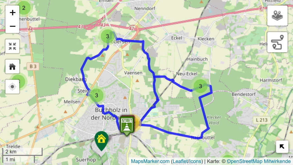 Der Regionalpark Rosengarten nennt diesen Weg Wander-Tour Buchholz und und hat ihm als Kennung die Nummer 3 gegeben. Auf der Webseite (Link) bieten sie auch eine Beschreibung per PDF sowie alle drei Touren in einer GPX-Datei an.